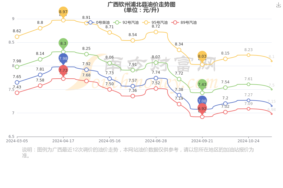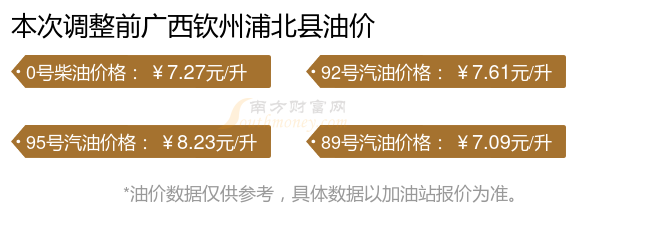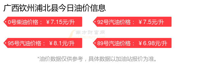 广西钦州浦北县汽油柴油12月28日的价格每升多少钱?具体为:92号汽油为7.5元,下降了0.11元;95号汽油为8.1元,下降了0.13元;89号汽油为6.98元,下降了0.11元;0号柴油为7.15元,下降了0.12元,本轮油价的调整时间为11月7日。