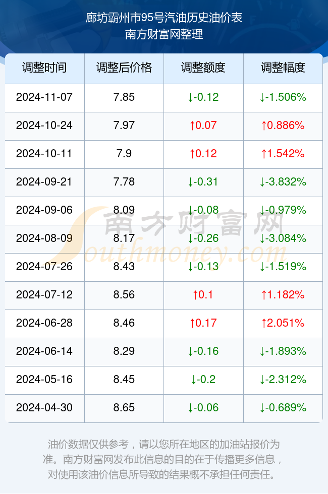 廊坊霸州市95号汽油历史油价表