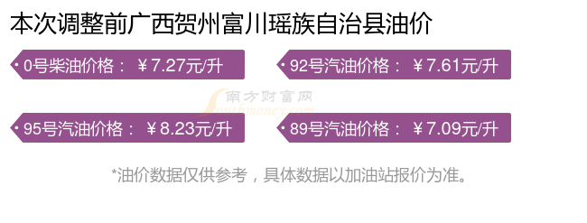 12月28日,广西贺州富川瑶族自治县汽油、柴油每升最新价格为(11月7日调整后的价格):92号汽油为7.5元,减了0.11元,减幅达1.45%;95号汽油为8.1元,减了0.13元,减幅达1.58%;89号汽油为6.98元,减了0.11元,减幅达1.55%;0号柴油为7.15元,减了0.12元,减幅达1.65%。
