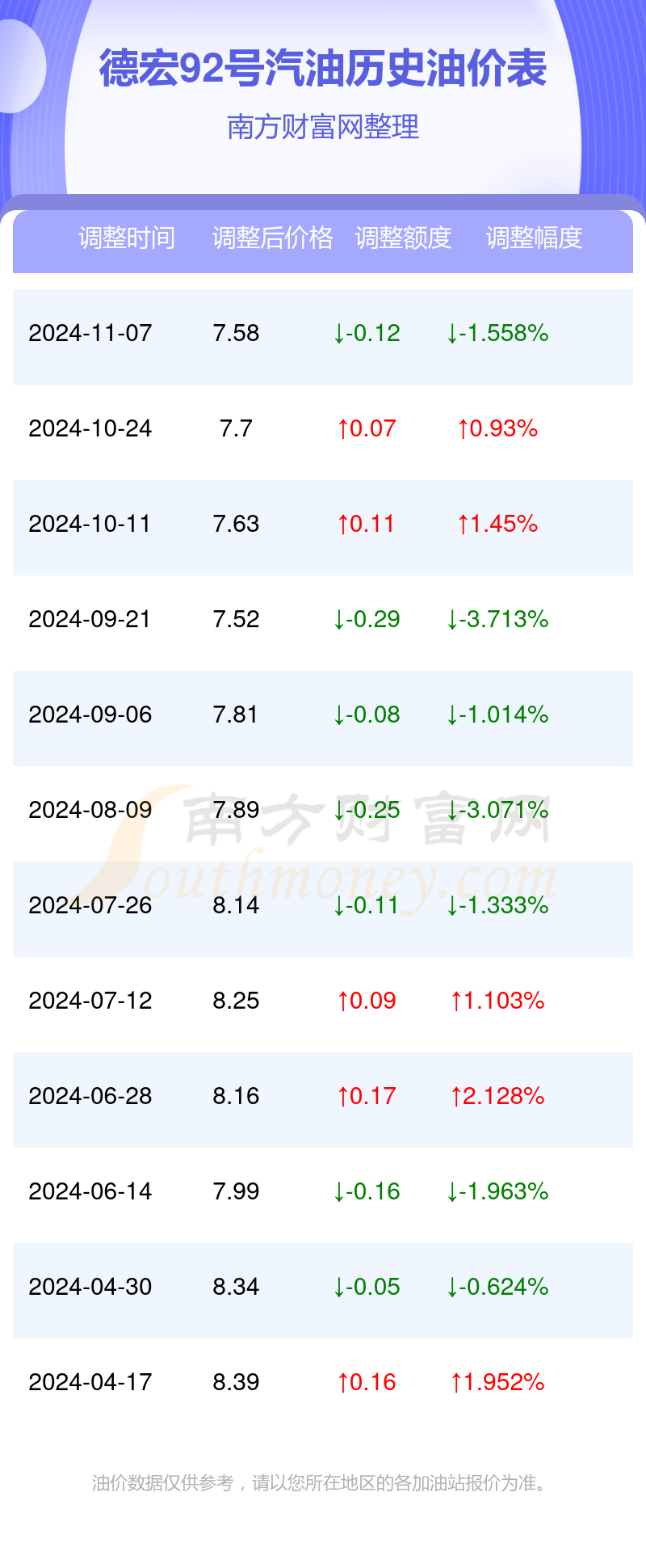 德宏92号汽油历史油价表