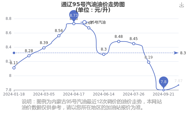 通辽95号汽油12月28日最新价格为7.87元每升,本轮油价调整时间为11月7日,相对上次调整时间9月21日的油价7.99元每升,共下降了0.12元,下降1.502%。