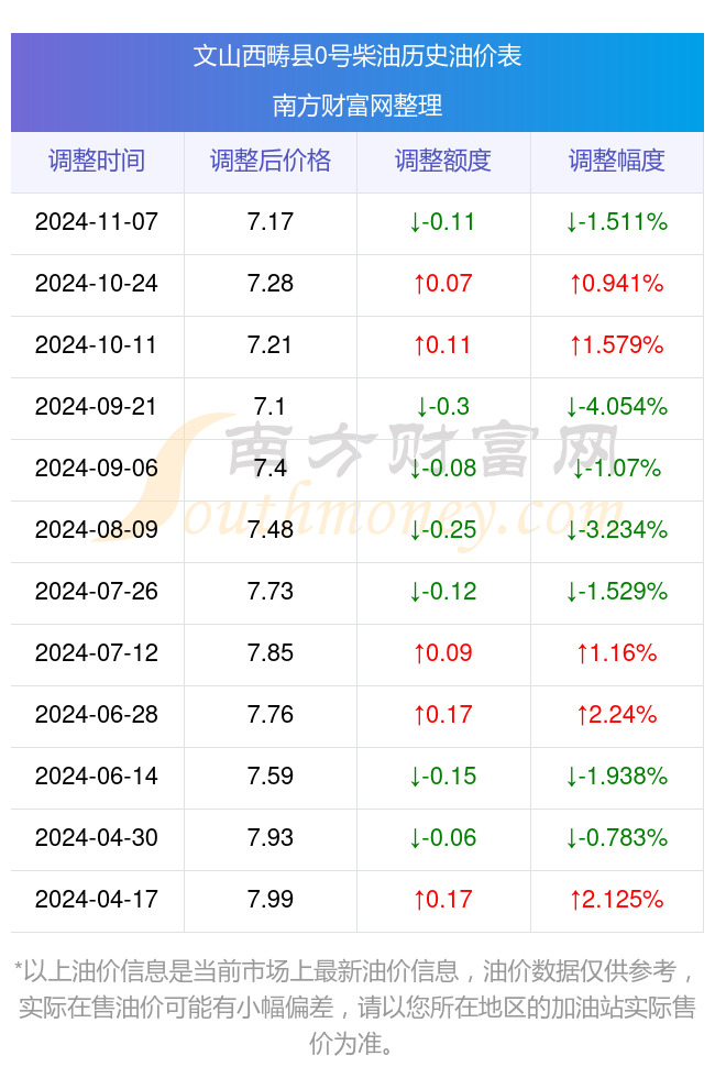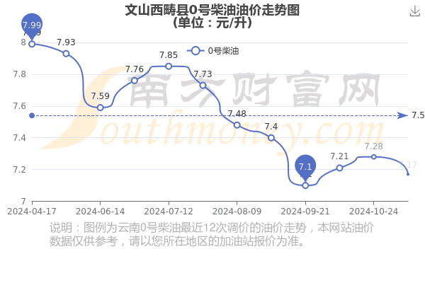 12月28日,文山西畴县最新价格为:7.17元每升,调整时间为11月7日,相对上次调整时间10月24日的油价7.28元每升,下降了0.11元,下降幅达1.511%。