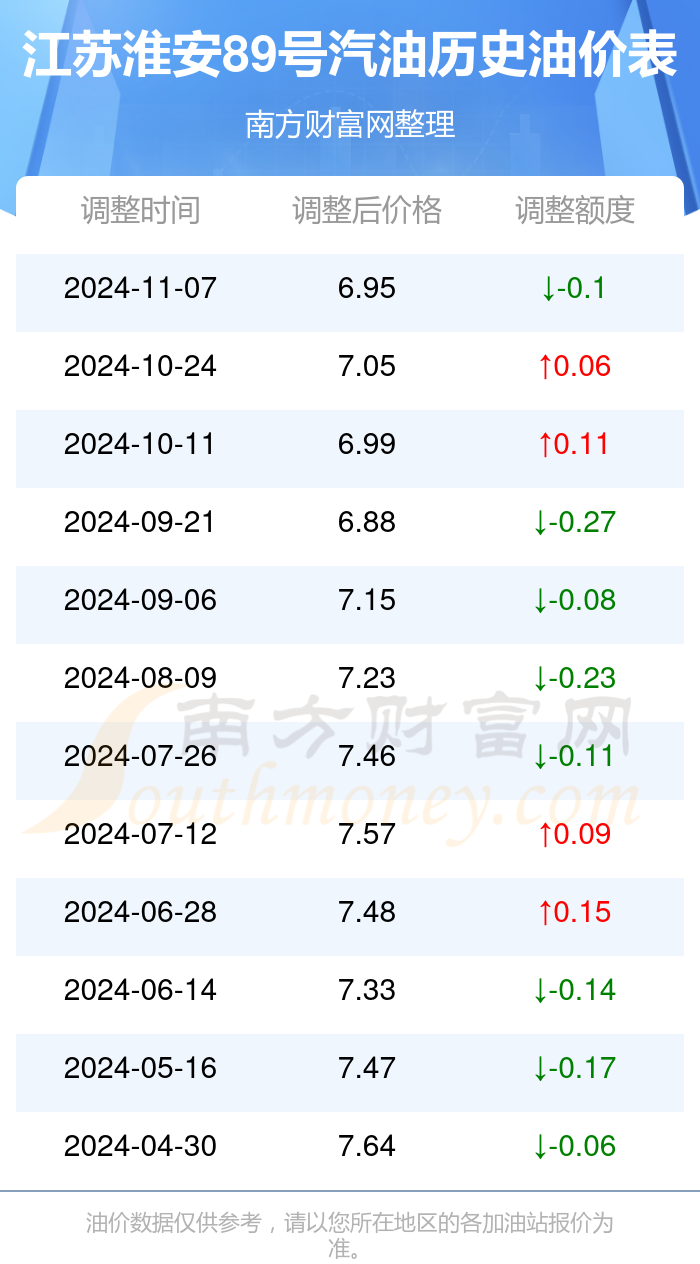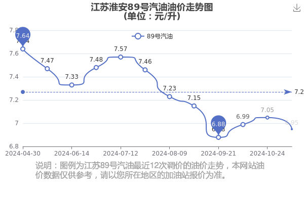 12月28日江苏淮安89号汽油的价格为6.95元/升,这是11月7日调整后的价格,相对上次调整时间10月24日的油价7.05元每升,减了0.1元,减幅达1.418%。