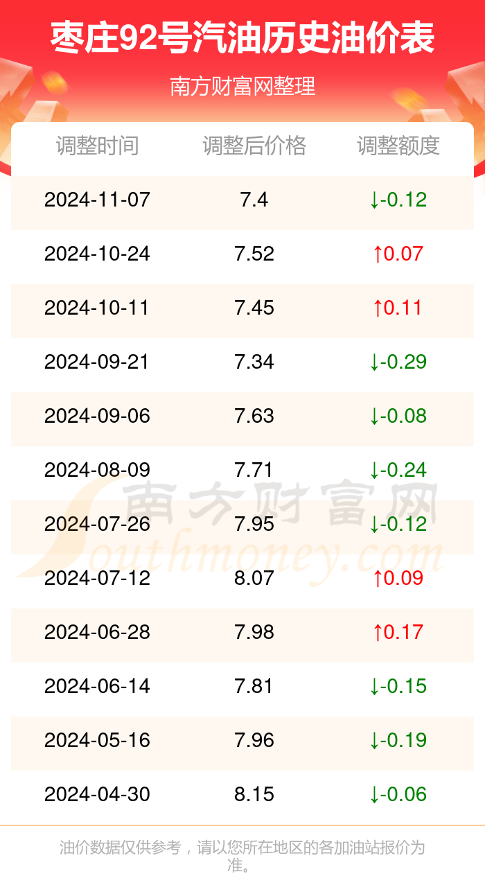 12月28日,枣庄92号汽油最新价格为7.4元/升,调整时间为11月7日,相对上次调整降了0.12元。