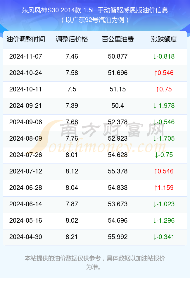 按11月7日92号汽油最新调整价格7.46元每升来计算(以广东为例),该车型百公里平均油费为50.877元,按上一轮10月24日调整价格7.58元每升来计算,百公里平均油费为51.696元,对比上一轮少花0.818元,下一轮油价调整时间为12月31日24时。