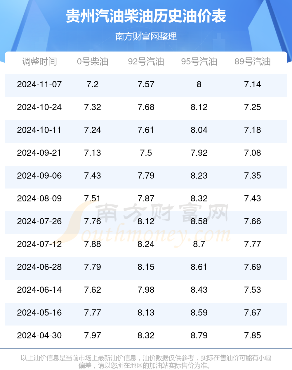 以上数据仅供参考,请以您所在地区的加油站实际售价为准。油价发布此信息的目的在于传播更多信息,对使用该油价信息所导致的结果概不承担责任。