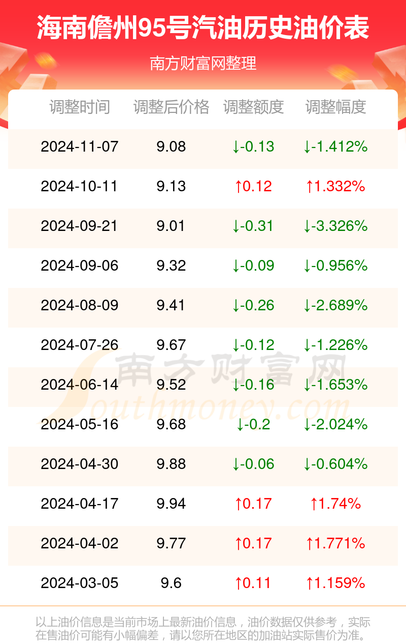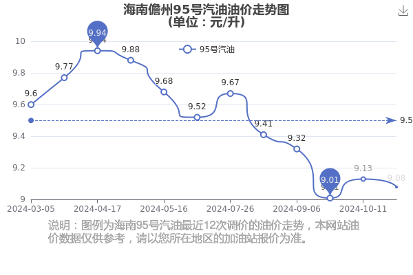 12月28日海南儋州95号汽油的价格是11月7日调整后的价格,具体为9.08元/升,对比上次调整时间10月11日的油价9.21元每升,下降了0.13元,下降幅达1.412%。