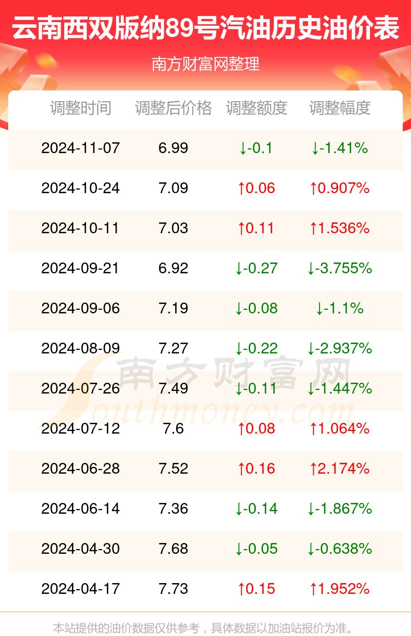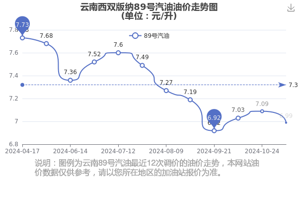 云南西双版纳89号汽油12月28日的价格为6.99元/升,本次油价的调整时间为11月7日,对比上次油价调整时间10月24日的价格7.09元/升,共下降了0.1元,下降幅达1.41%。