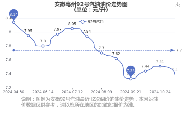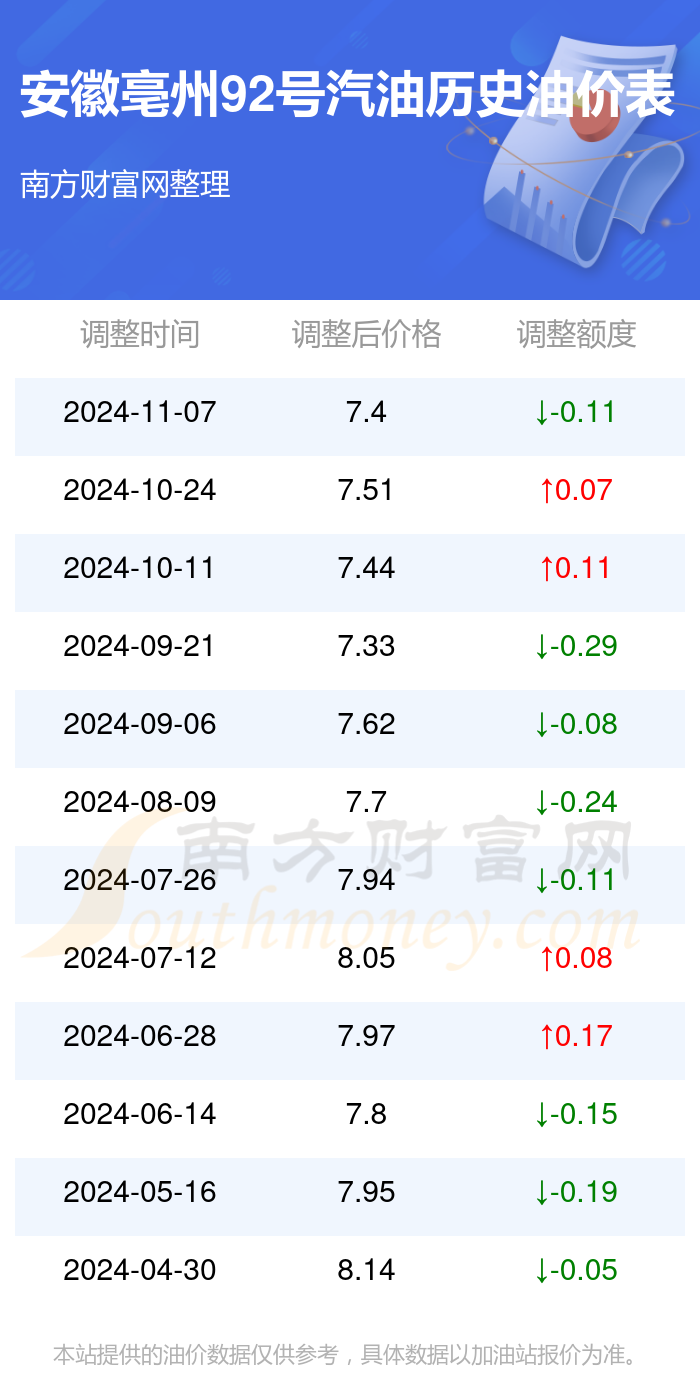 12月28日安徽亳州92号汽油的价格为7.4元/升,本轮油价的调整时间为11月7日,相对上一轮油价调整时间10月24日的价格7.51元/升,减了0.11元,减幅达1.465%。