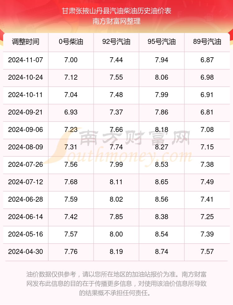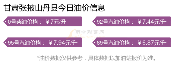 12月28日甘肃张掖山丹县汽油、柴油价格是11月7日调整后的价格,每升价格具体为:92号汽油为7.44元,下跌了0.11元,下跌幅达1.46%;95号汽油为7.94元,下跌了0.12元,下跌幅达1.49%;89号汽油为6.87元,下跌了0.11元,下跌幅达1.58%;0号柴油为7元,下跌了0.12元,下跌幅达1.69%。