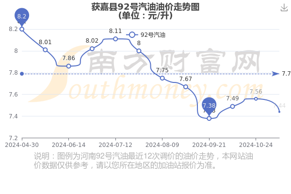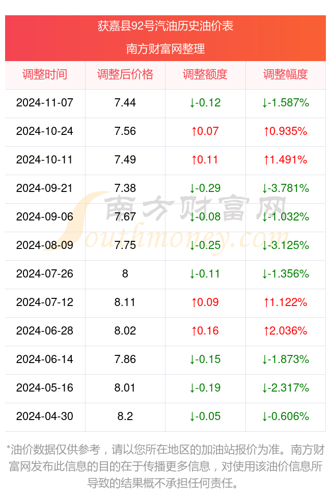 获嘉县92号汽油12月28日的最新价格(11月7日油价调整后的价格):获嘉县92号汽油7.44元/升,相对上次调整时间10月24日的油价7.56元每升,下跌了0.12元,下跌1.587%。