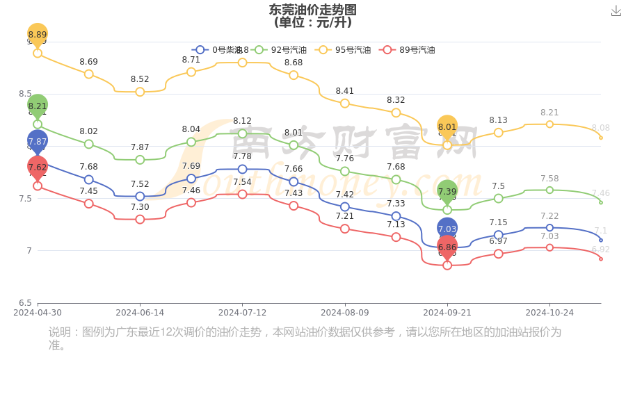 东莞汽油柴油12月28日每升的价格为11月7日调整后的价格,各油价详情如下:92号汽油7.46元;95号汽油8.08元;89号汽油6.92元;0号柴油7.1元。