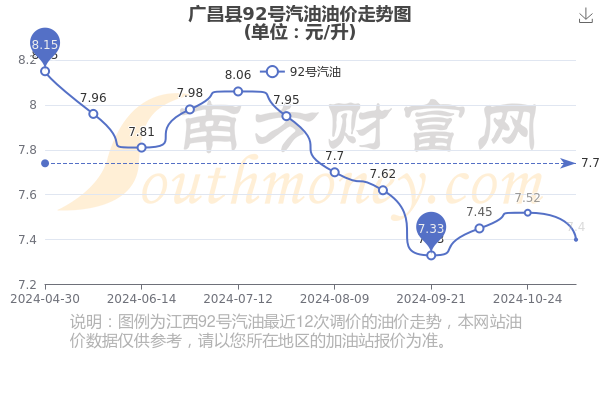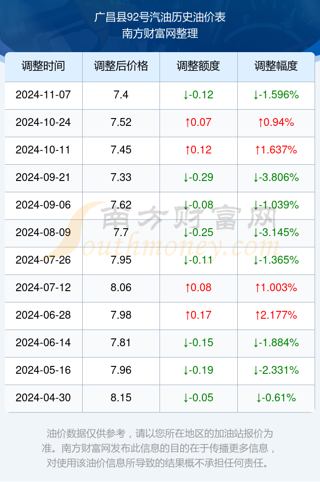 12月28日广昌县92号汽油的价格为11月7日调整后的价格,具体为:7.4元每升,相对上次调整时间10月24日的油价7.52元每升,降了0.12元,降幅达1.596%。