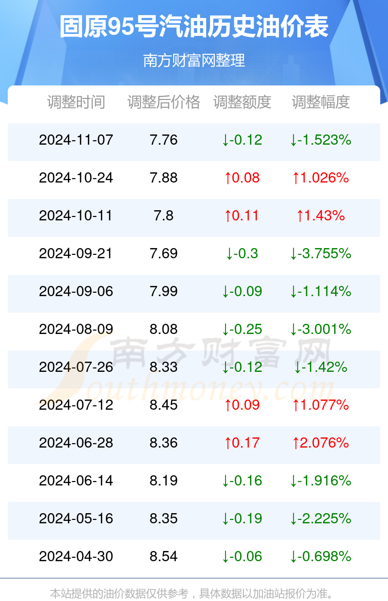 12月28日固原95号汽油的最新价格:固原95号汽油7.76元/升(根据11月7日调整后的价格),相对上次调整时间10月24日的油价7.88元每升,减了0.12元,减1.523%。