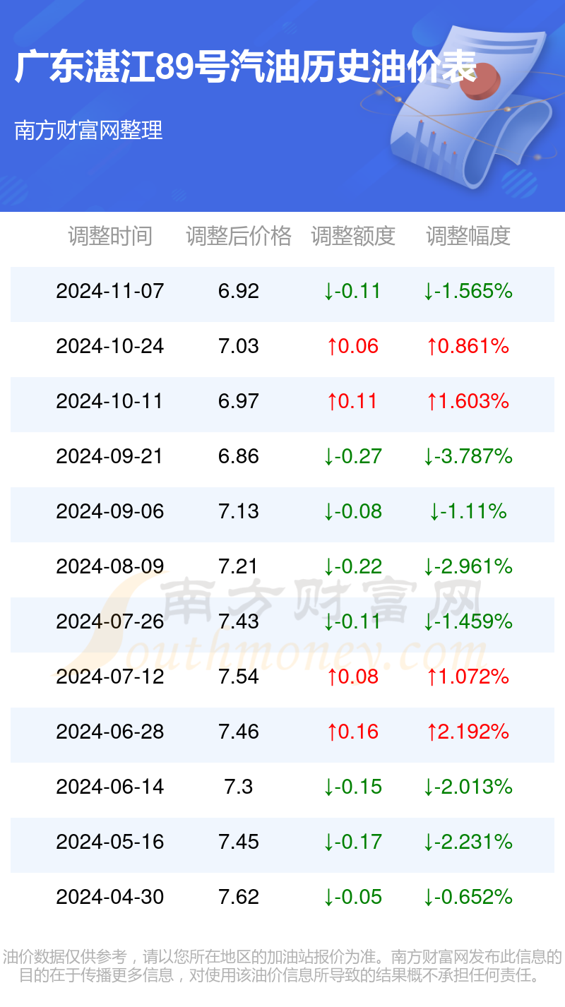 12月28日广东湛江89号汽油的价格为6.92元/升,为11月7日油价调整后的价格,相对上次调整下跌了0.11元,下跌1.565%。
