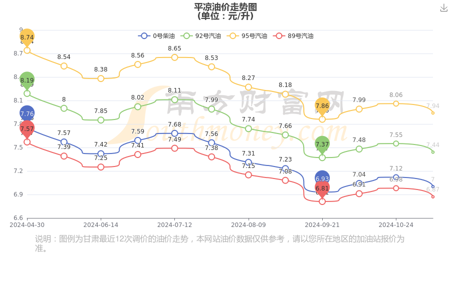 油价数据仅供参考,请以您所在地区的加油站报价为准。油价发布此信息的目的在于传播更多信息,对使用该油价信息所导致的结果概不承担任何责任。