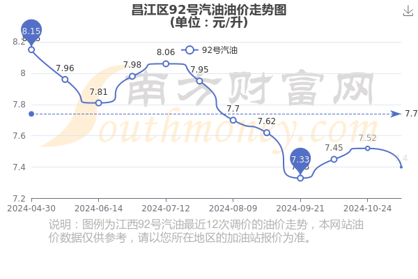 12月28日昌江区92号汽油的价格为7.4元/升,为11月7日油价调整后的价格,相对上次调整减了0.12元,减1.596%。