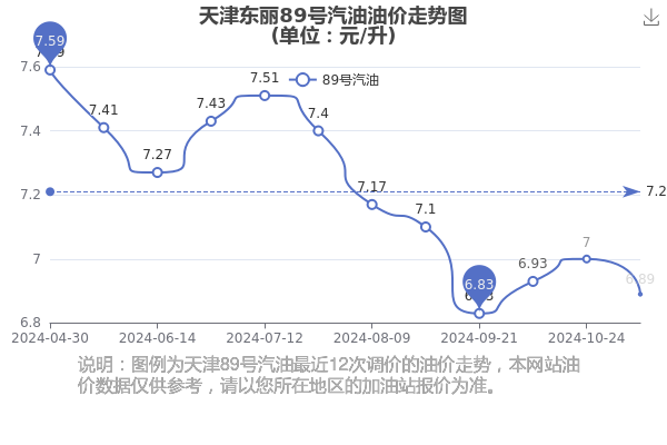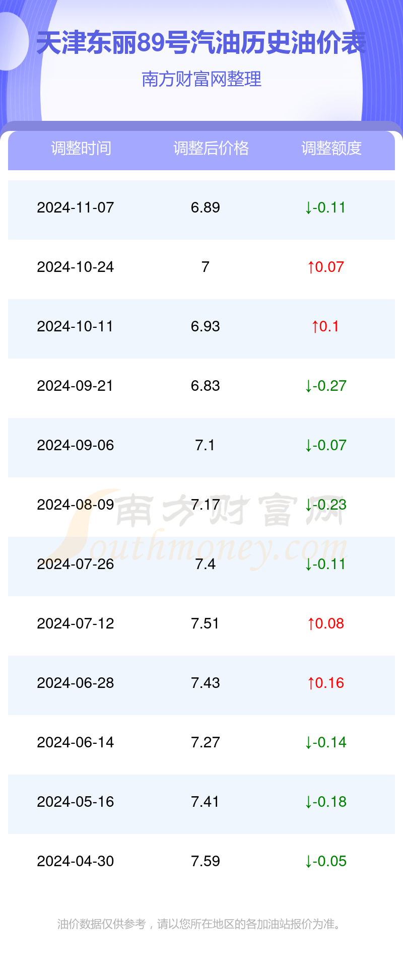 12月28日天津东丽89号汽油的价格为6.89元每升,本次调整时间为11月7日,相对上次调整时间10月24日的油价7元每升,降了0.11元,降幅达1.571%。