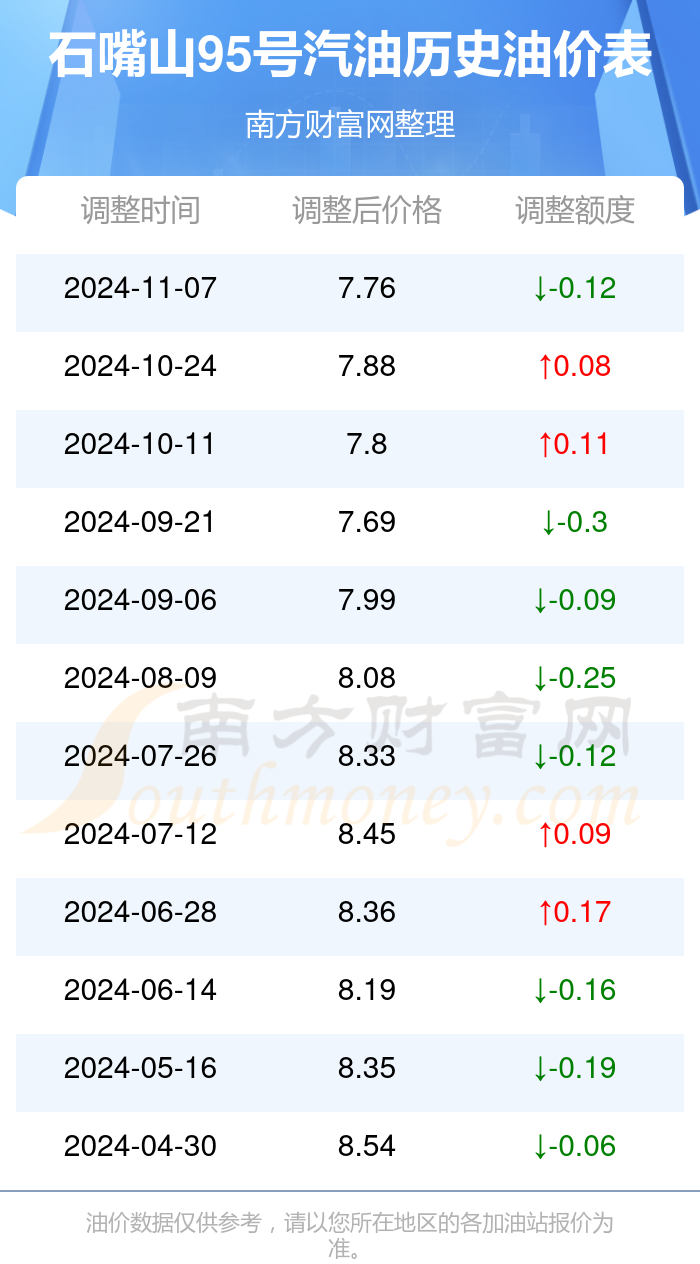 12月28日石嘴山95号汽油的价格为7.76元每升,本次调整时间为11月7日,相对上次调整时间10月24日的油价7.88元每升,降了0.12元,降幅达1.523%。