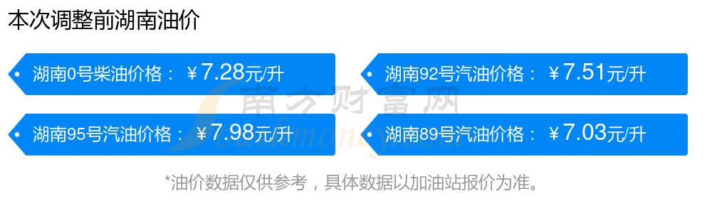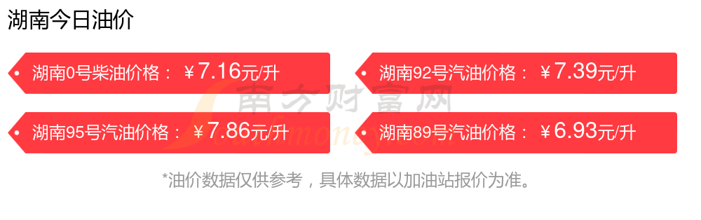 12月28日湖南汽油、柴油每升的价格为11月7日调整后的价格,92号汽油为7.39元,下跌了0.12元,下跌幅达1.54%;95号汽油为7.86元,下跌了0.12元,下跌幅达1.54%;89号汽油为6.93元,下跌了0.11元,下跌幅达1.54%;0号柴油为7.16元,下跌了0.12元,下跌幅达1.66%。