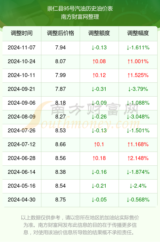 12月28日崇仁县95号汽油的价格是7.94元/升,油价于11月7日调整,相对上次调整时间10月24日的油价8.07元每升,共跌了0.13元,跌幅达1.611%。