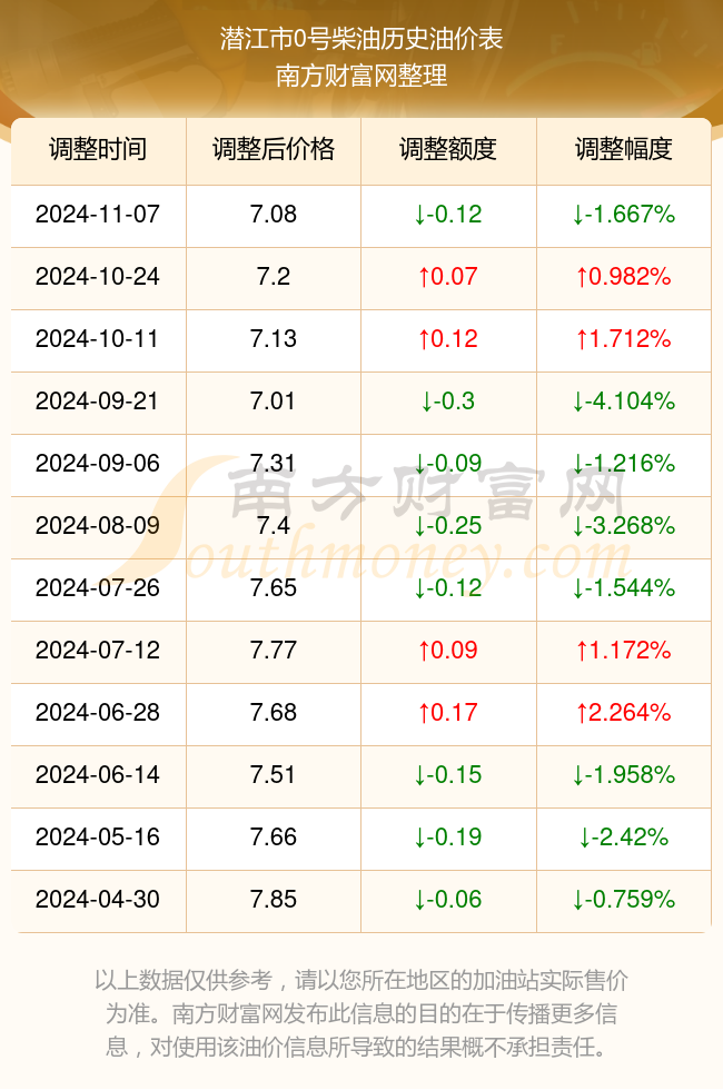 潜江市0号柴油12月28日的价格为7.08元/升,本次油价的调整时间为11月7日,对比上次油价调整时间10月24日的价格7.2元/升,共跌了0.12元,跌幅达1.667%。