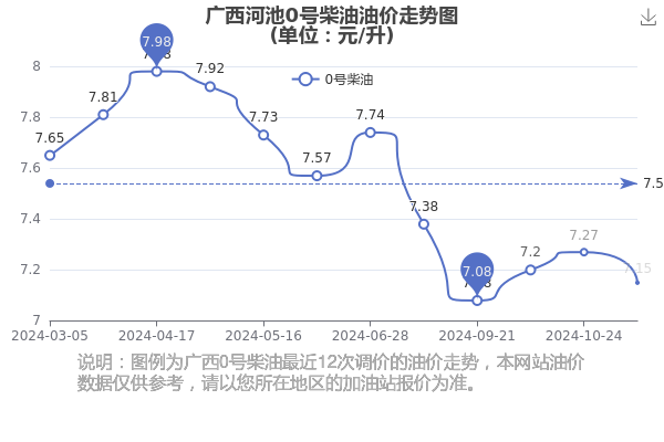广西河池0号柴油12月28日价格查询(11月7日油价调整后的价格):广西河池0号柴油7.15元/升,相对上次调整时间10月24日的油价7.27元每升,减了0.12元,减1.651%。