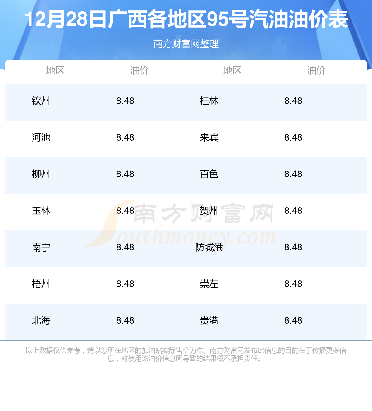 广西各地区最新95号汽油油价表