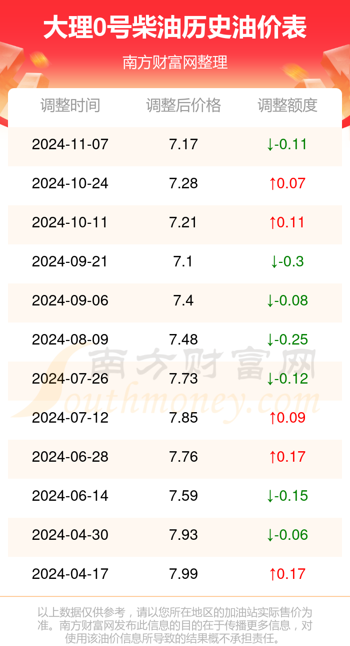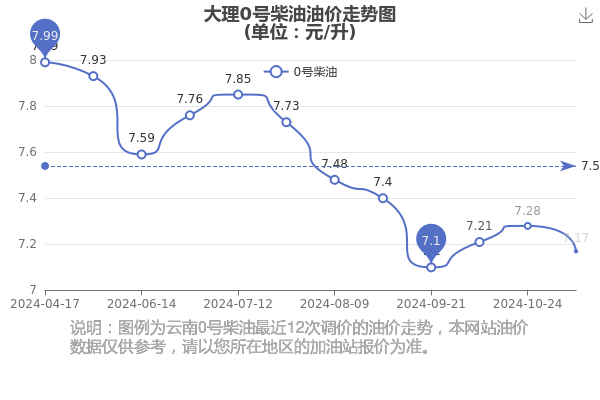 12月28日大理0号柴油的价格为11月7日油价调整后的价格,每升7.17元,对比上一轮油价调整时间10月24日的价格7.28元每升,下跌了0.11元,下跌幅达1.511%。
