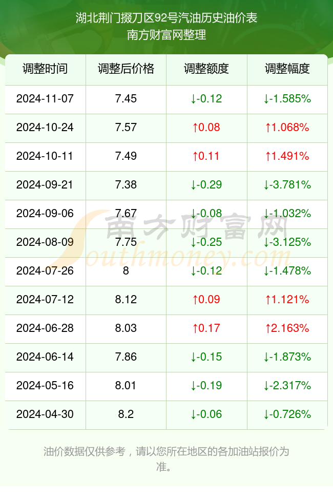 湖北荆门掇刀区92号汽油历史油价表