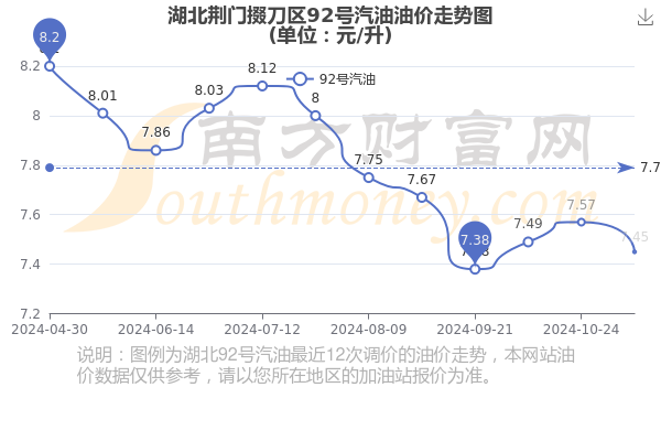 12月28日湖北荆门掇刀区92号汽油价格查询:每升7.45元(11月7日油价调整后的价格),相对上次调整时间10月24日的油价7.57元每升,减了0.12元,减1.585%。