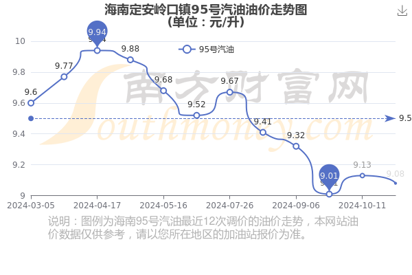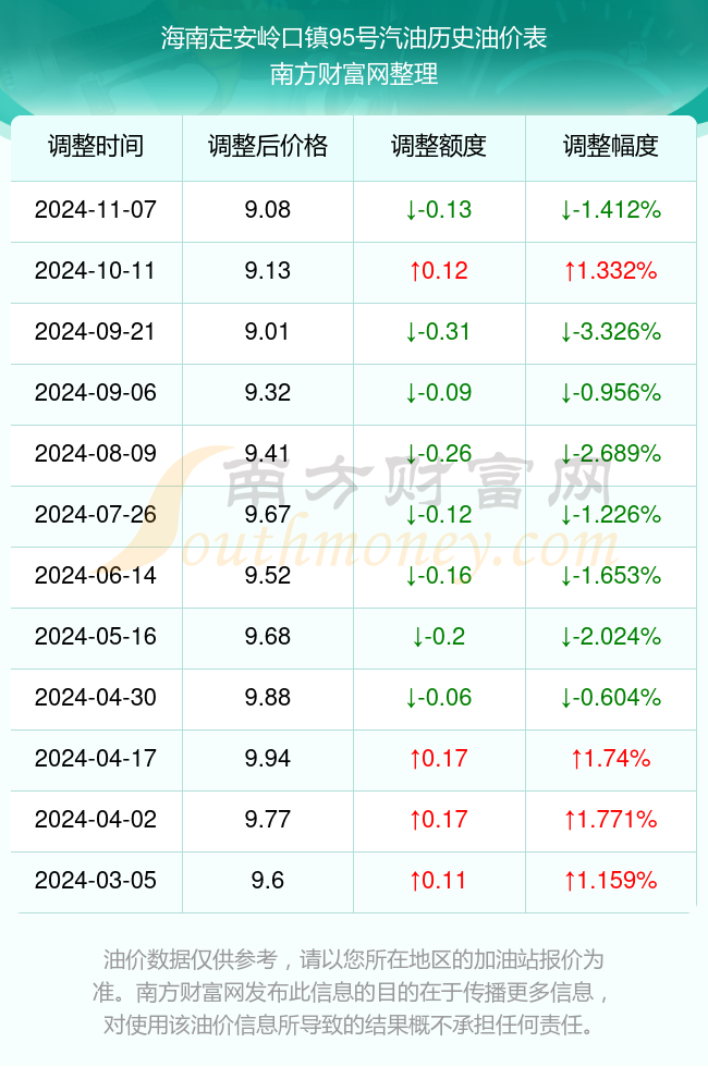 海南定安岭口镇95号汽油12月28日的价格为9.08元/升,本次油价的调整时间为11月7日,对比上次油价调整时间10月11日的价格9.21元/升,共跌了0.13元,跌幅达1.412%。