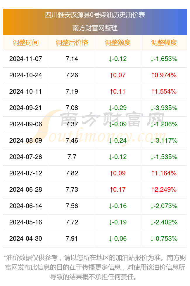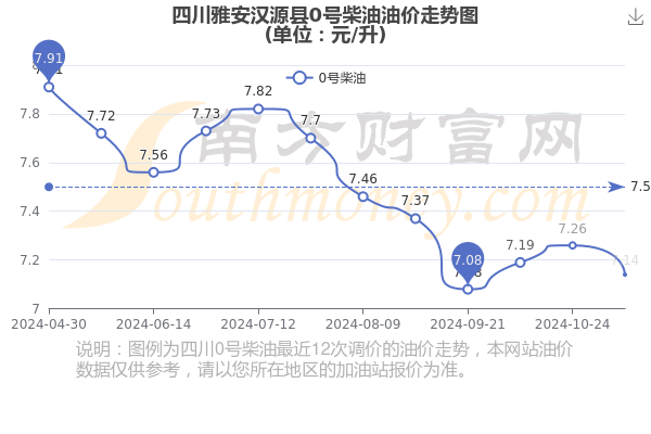 四川雅安汉源县0号柴油12月28日价格查询:11月7日油价调整后,四川雅安汉源县0号柴油7.14元/升,相对上次调整时间10月24日的油价7.26元每升,降了0.12元,降1.653%。