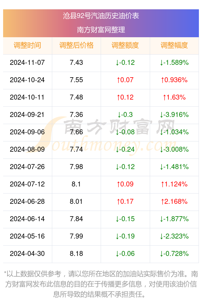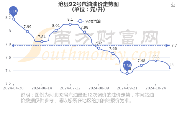 12月28日沧县92号汽油的价格为11月7日油价调整后的价格,具体是每升7.43元,相对上次调整时间10月24日的油价7.55元每升,共下跌了0.12元,下跌1.589%。