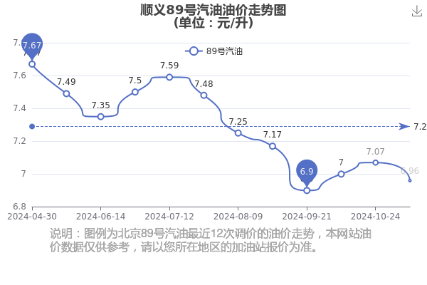 顺义89号汽油12月28日价格(11月7日调整后的价格):6.96元每升,对比上次调整(10月24日)的价格7.07元每升下调了0.11元,下调幅达1.556%。