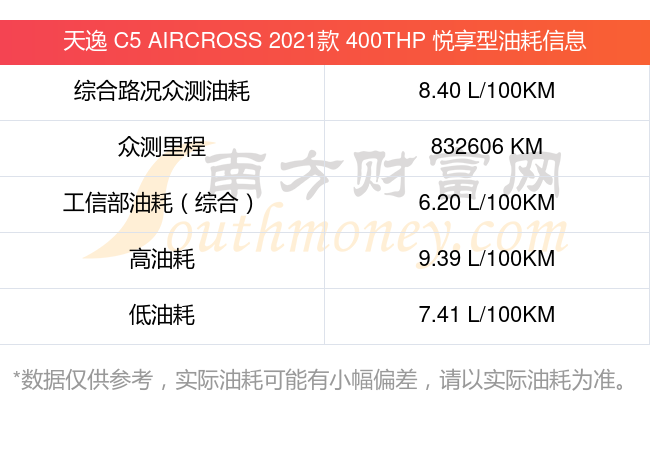 根据多位车主实测得出数据,该车型低油耗为7.41升/百公里,高油耗为9.39升/百公里,综合路况众测油耗为8.40升/百公里,工信部综合油耗为6.20升/百公里。