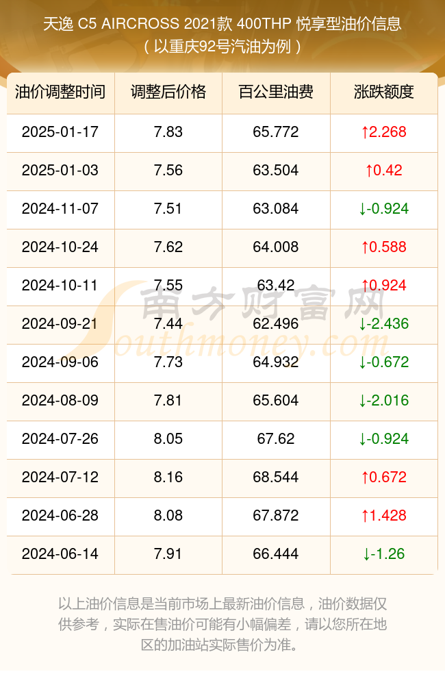 按1月17日92号汽油最新调整价格7.83元每升来计算(以重庆为例),该车型百公里平均油费为65.772元,按上一轮1月3日调整价格7.56元每升来计算,百公里平均油费为63.504元,对比上一轮多花2.268元,下一轮油价调整时间为12月31日24时。