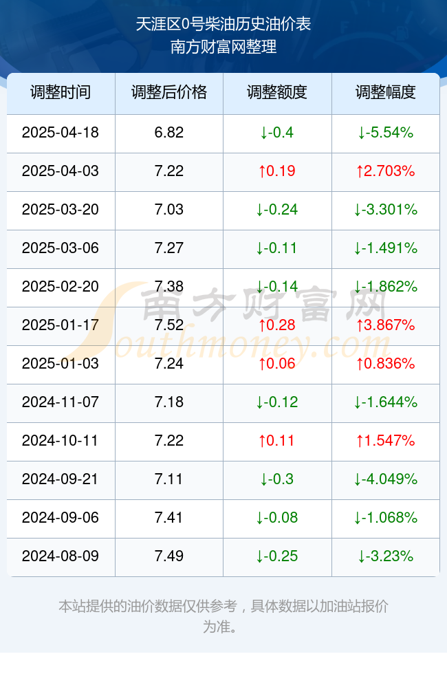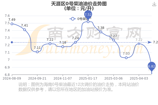 天涯区0号柴油4月29日的最新价格为6.82元/升,调整时间为4月18日,相对上次调整减了0.4元。