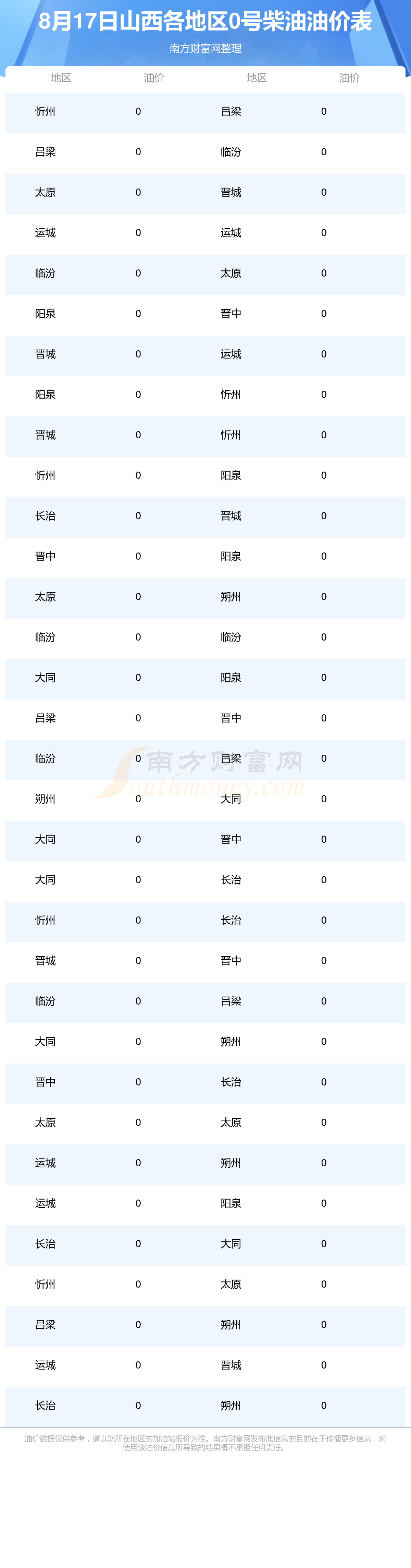 2025年最新国内各地最新油价一览,8月17日今日0号柴油价格查询