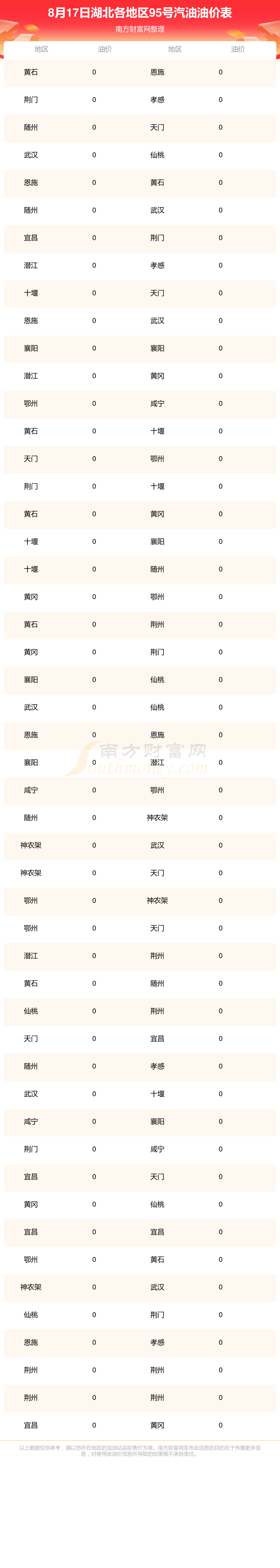 湖北各地区最新95号汽油油价表