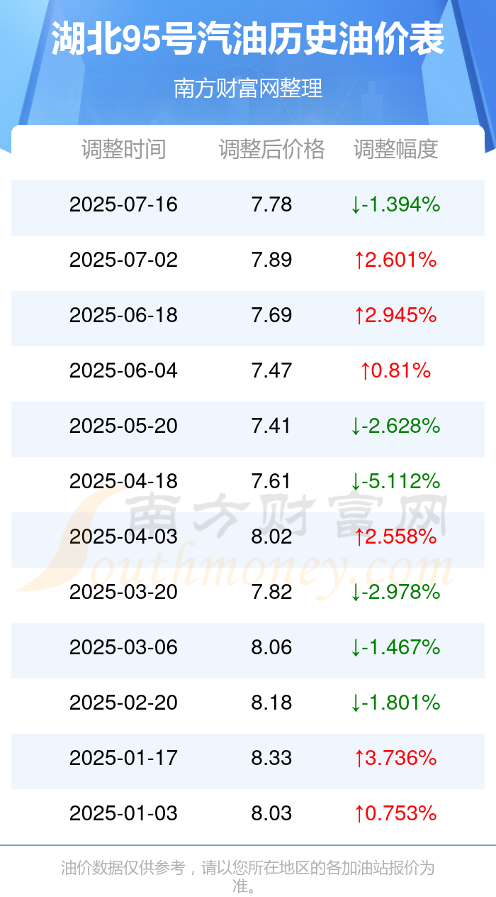 湖北95号汽油历史油价表