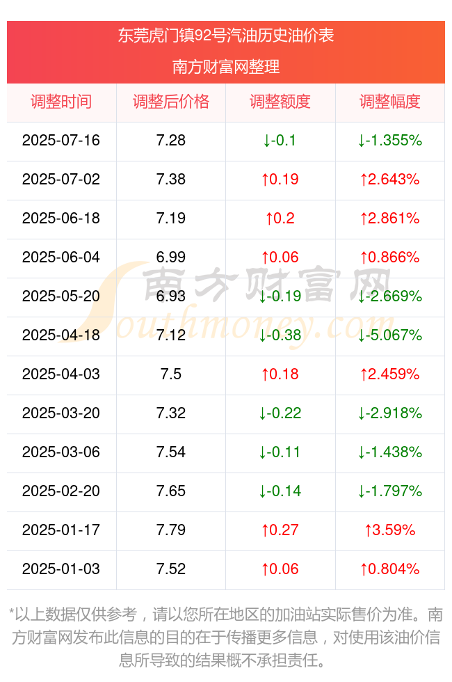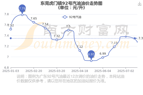 东莞虎门镇92号汽油8月17日的价格为7月16日调整后的价格,具体为7.28元/升,相对上次调整下调了0.1元。