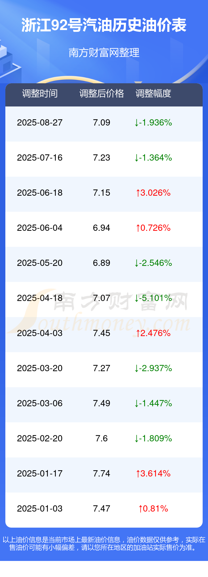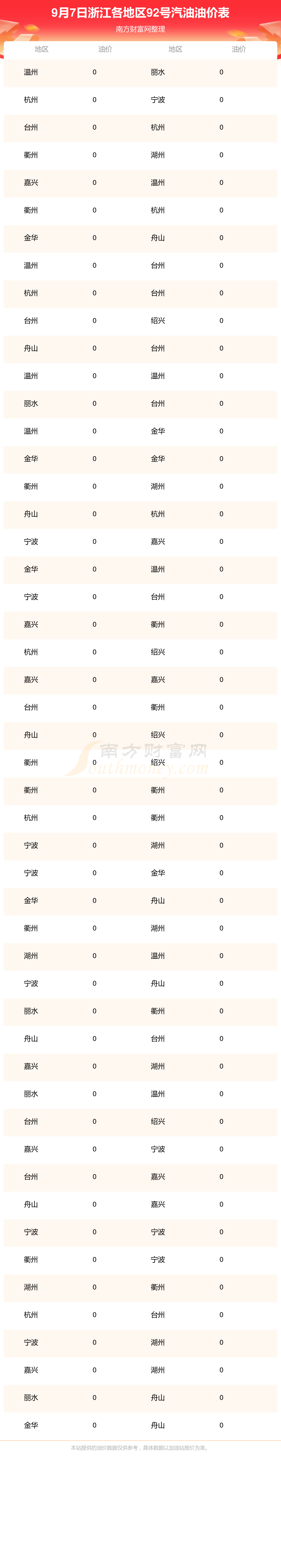 浙江各地区最新92号汽油油价表