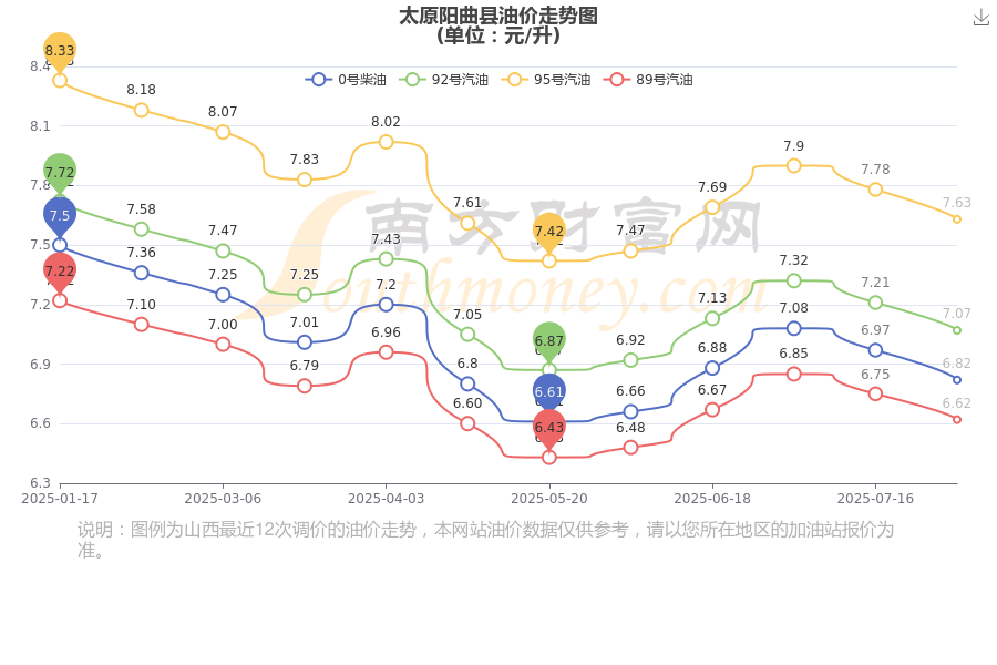 9月7日太原阳曲县汽油每升的价格为8月27日调整后的价格,具体价格如下:92号汽油7.07元;95号汽油7.63元;89号汽油6.62元;0号柴油6.82元。