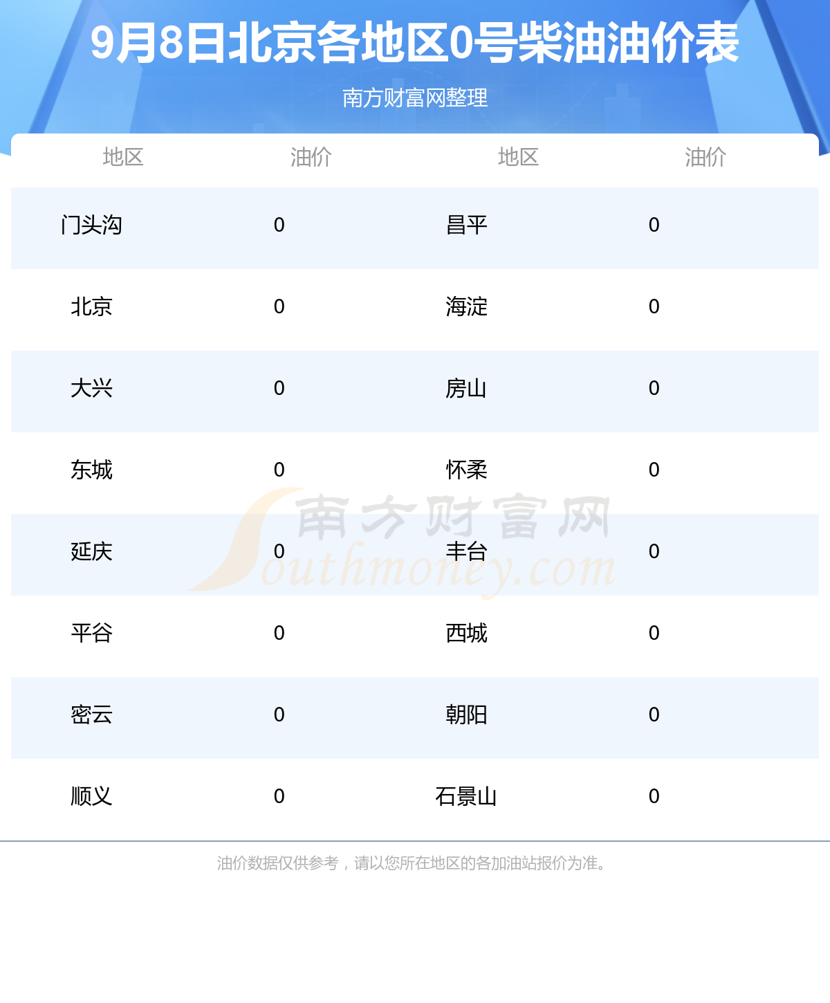 北京各地区最新0号柴油油价表