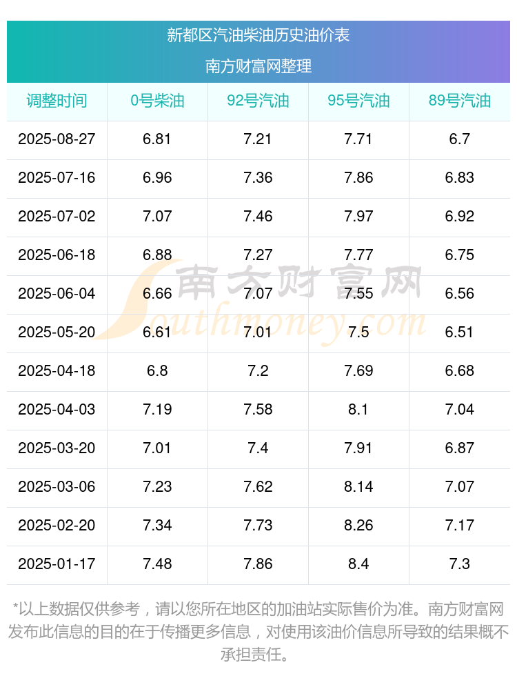 新都区汽油、柴油9月8日每升的价格为8月27日调整后的价格,具体油价为:92号汽油7.21元;95号汽油7.71元;89号汽油6.7元;0号柴油6.81元。