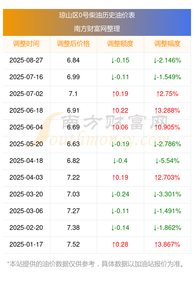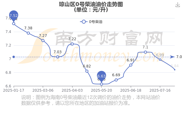 琼山区0号柴油9月8日的最新价格为6.84元/升,调整时间为8月27日,相对上次调整下调了0.15元。