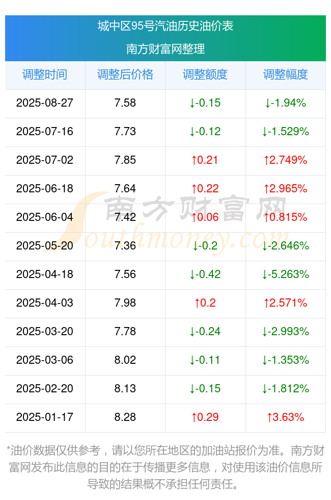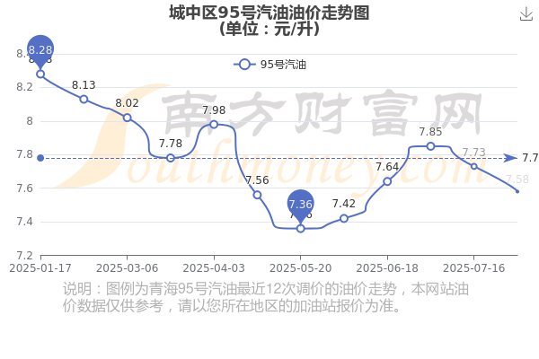 9月8日城中区95号汽油的价格为7.58元/升,为8月27日油价调整后的价格,相对上次调整下降了0.15元,下降1.94%。