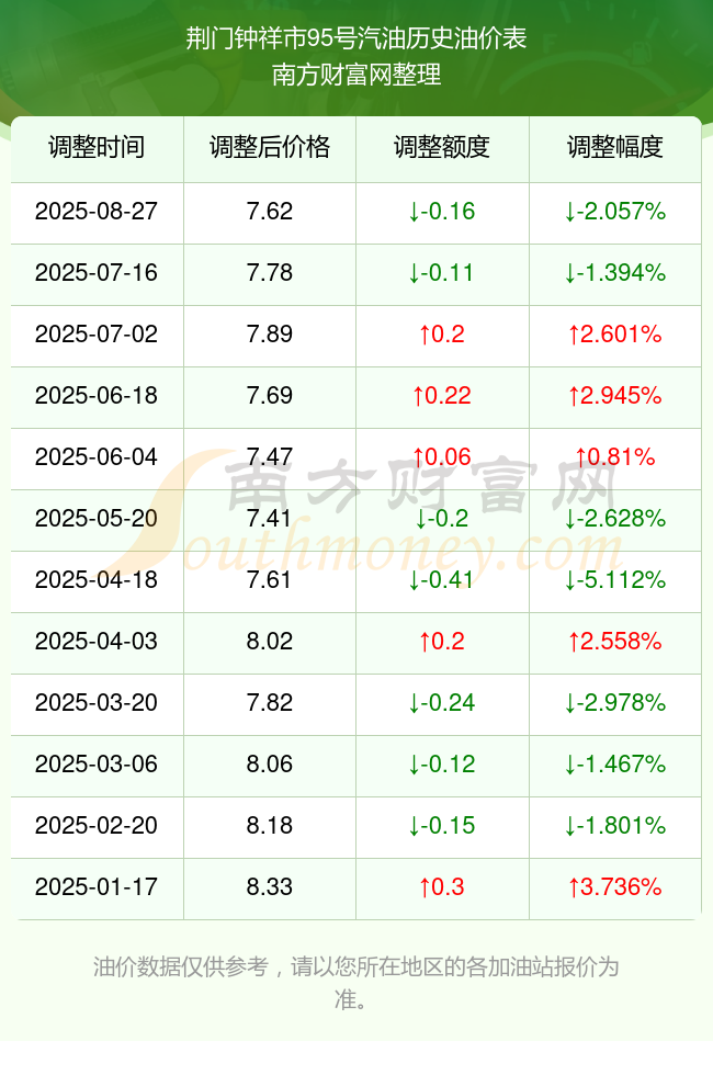 荆门钟祥市95号汽油历史油价表