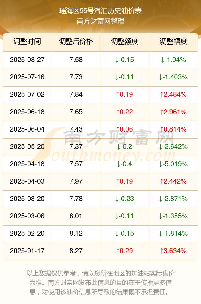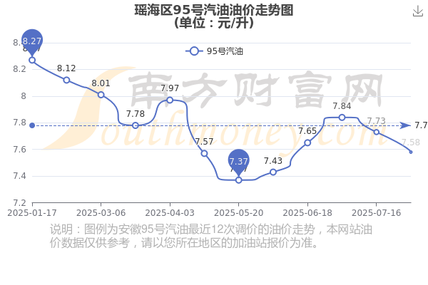 瑶海区95号汽油9月8日的价格为8月27日调整后的价格,具体为7.58元/升,相对上次调整降了0.15元。